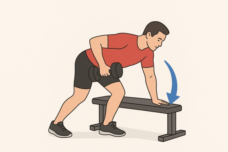 4. ワンハンドダンベルロウ — 8〜12回 × 3セット(左右)(休憩:60秒)