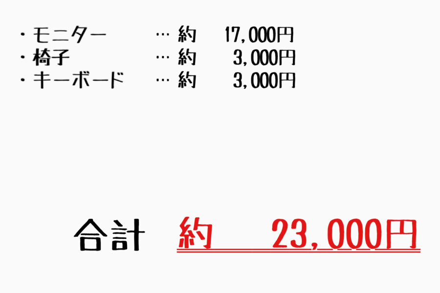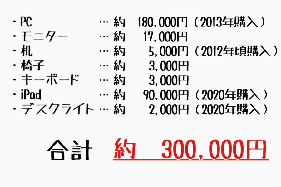 でも、他の人が一から同じ作業環境を作ろうと思ったときにかかる金額がイメージしやすいようにあえてPCの金額等も入れてみました!